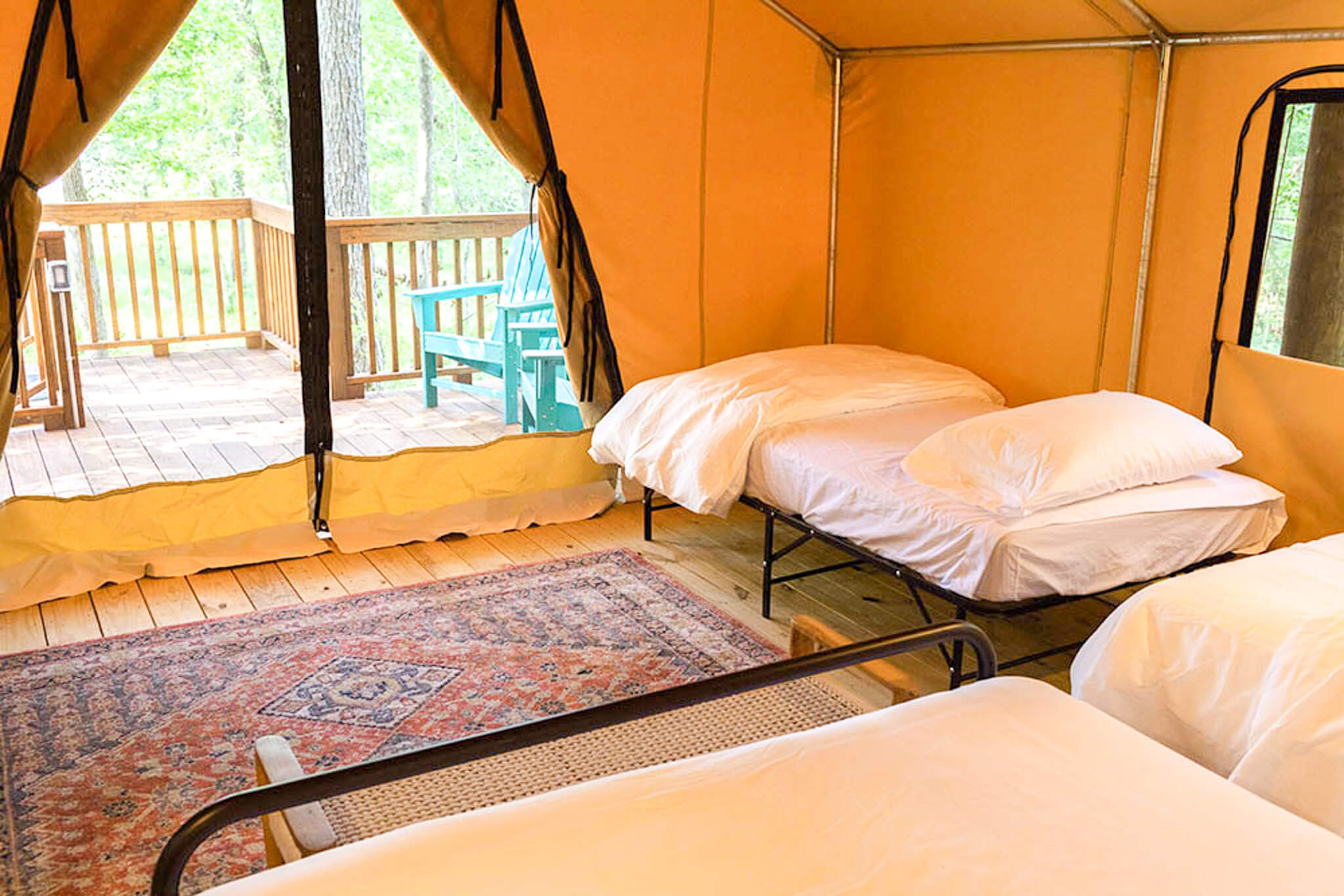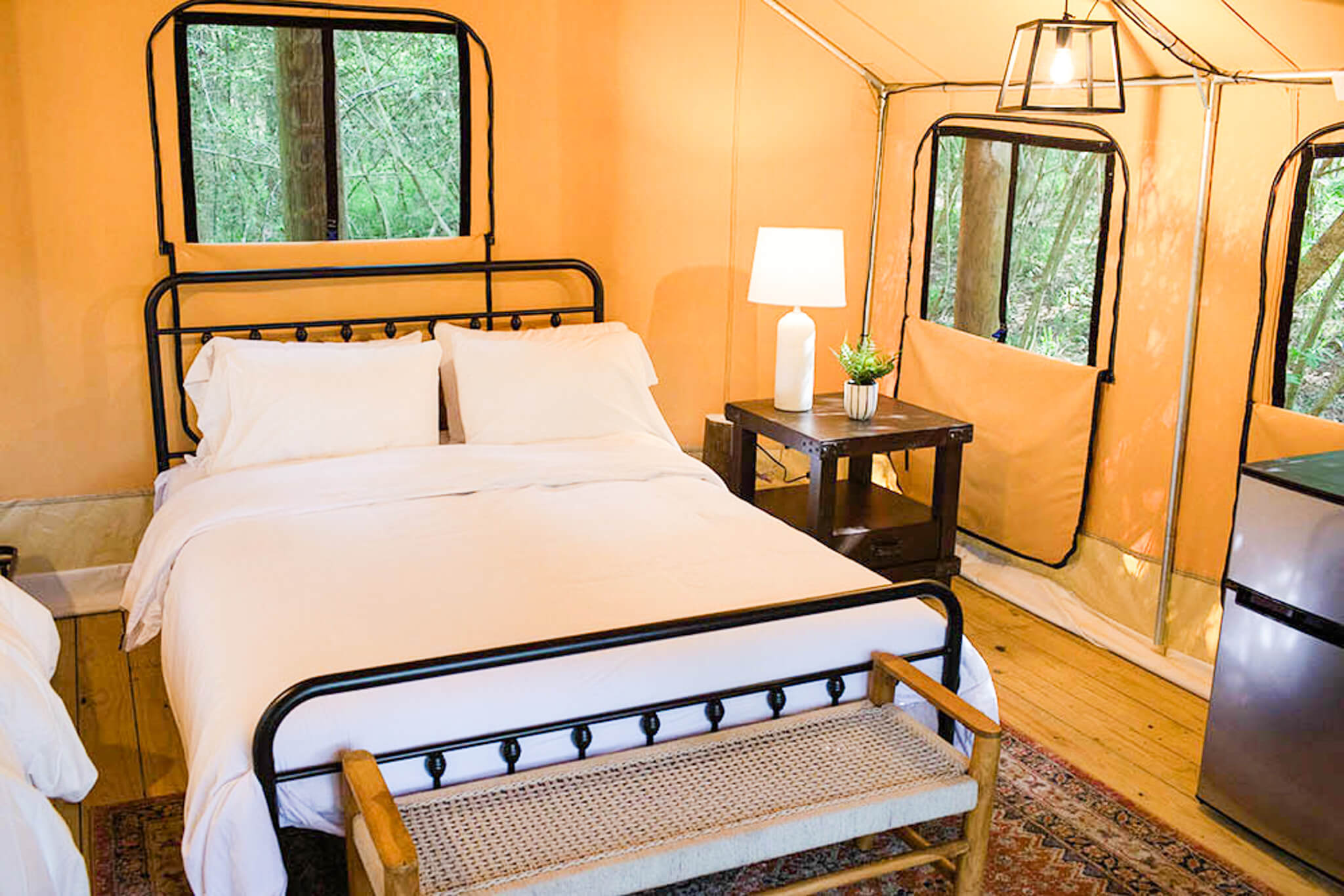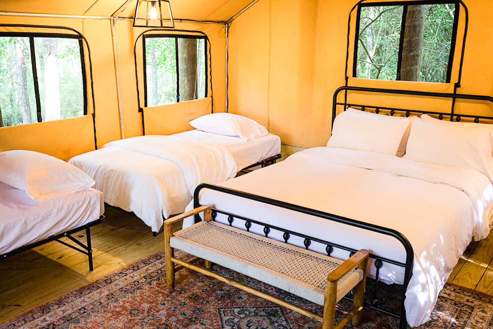 Hiker’s Hideaway offers an unforgettable glamping experience that blends the comforts of home with the great outdoors. This 14’x16′ expedition tent is nestled in the peaceful East Texas woods and comfortably sleeps up to four guests. Inside, you’ll find a luxurious queen-size bed, two twin beds, a bedside table, a fan, a refrigerator, and a coffee pot, providing you with all the essentials for a restful stay.