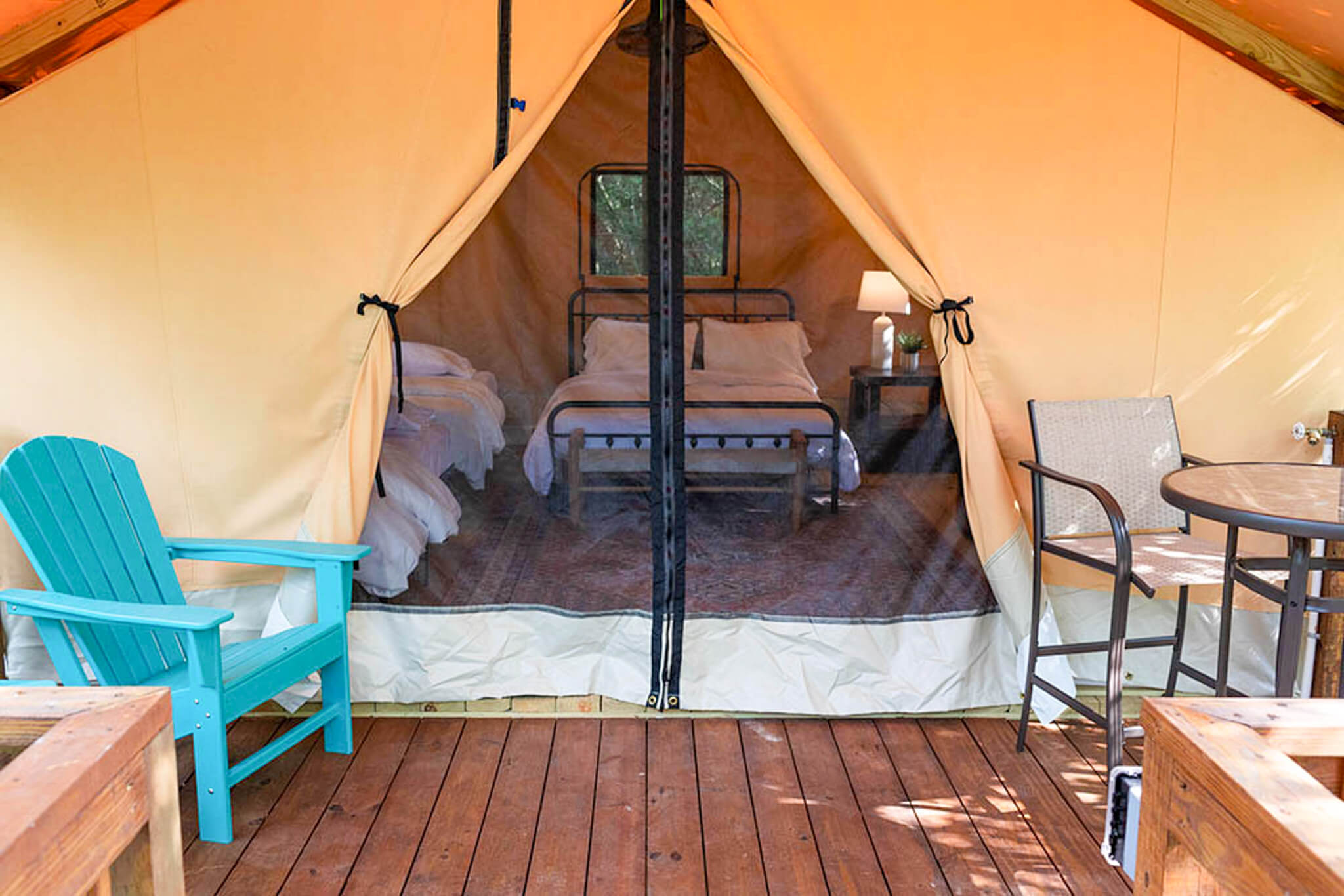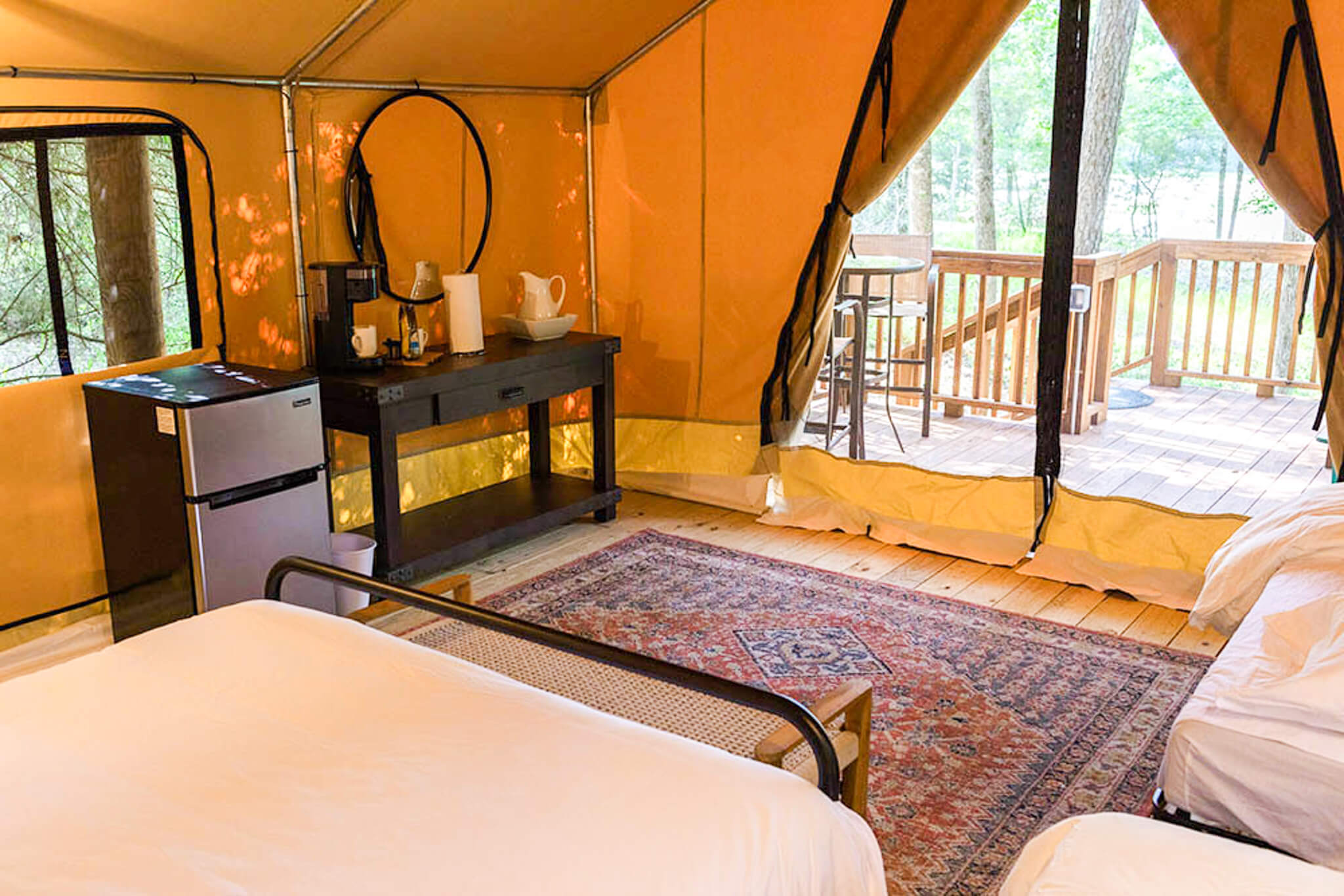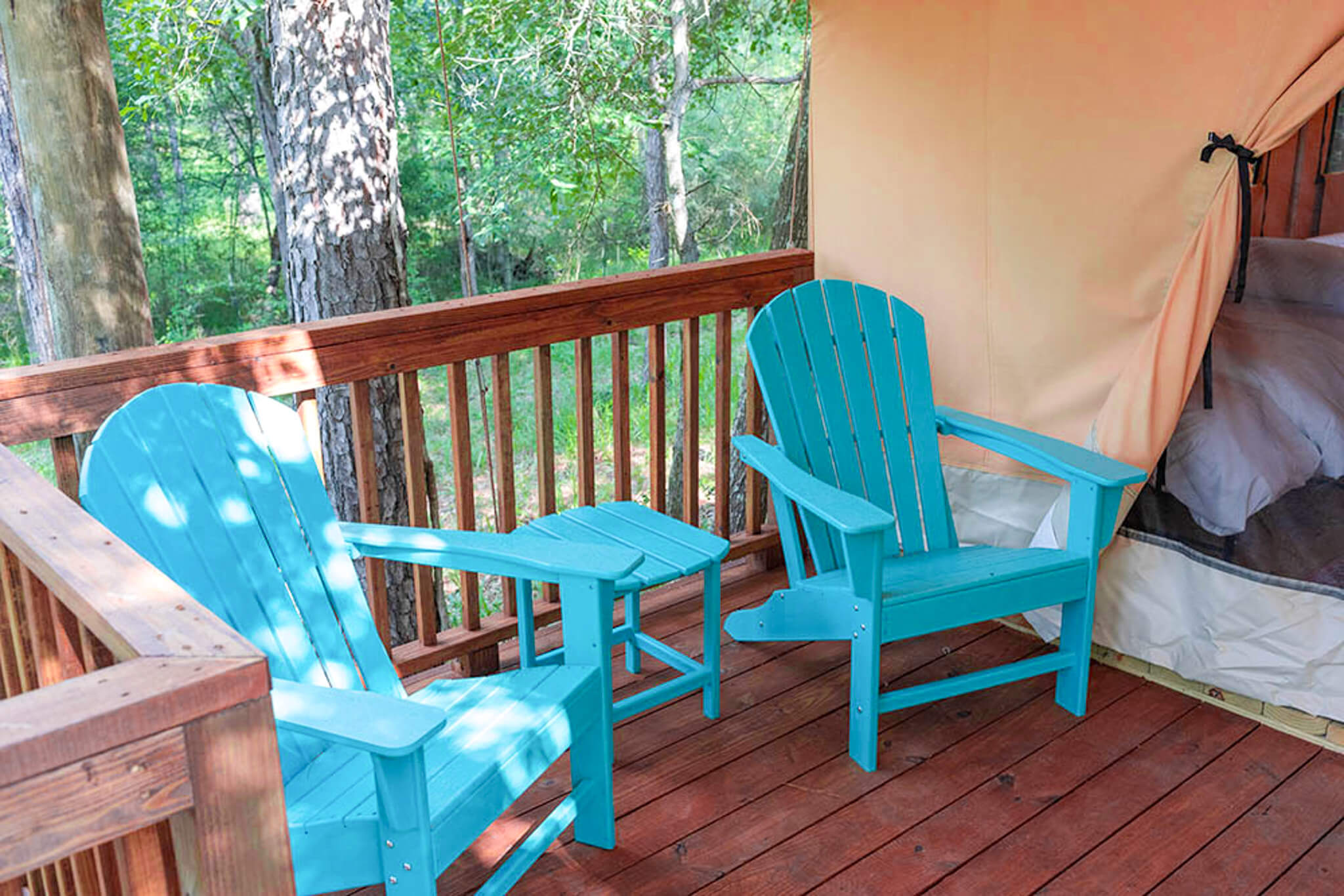 Step outside to the covered porch, where you can relax in two Adirondack chairs and enjoy the peaceful setting. The tent is equipped with portable air conditioning to keep you cool during warm nights, making it the perfect place to unwind after a day of outdoor adventure.