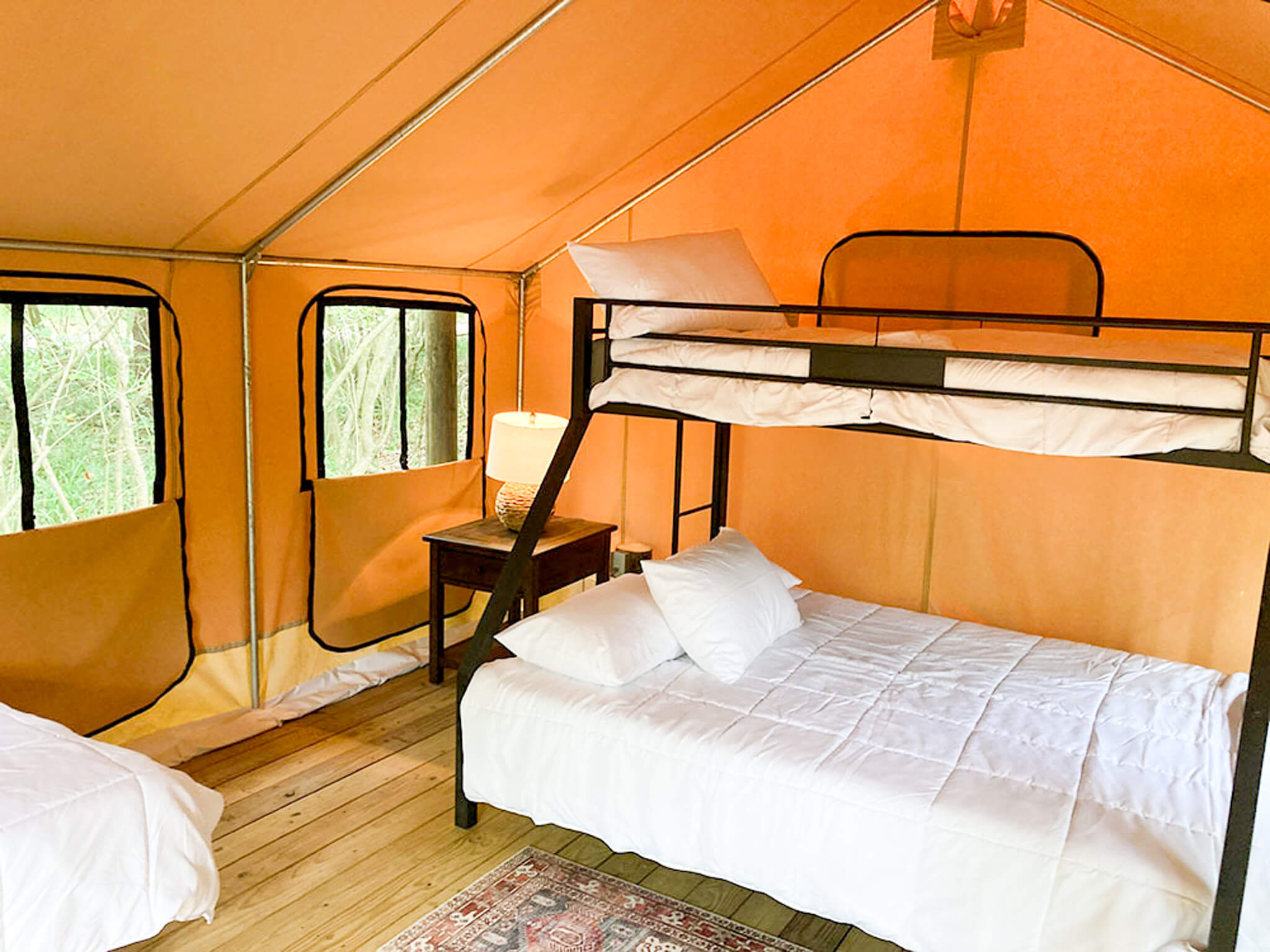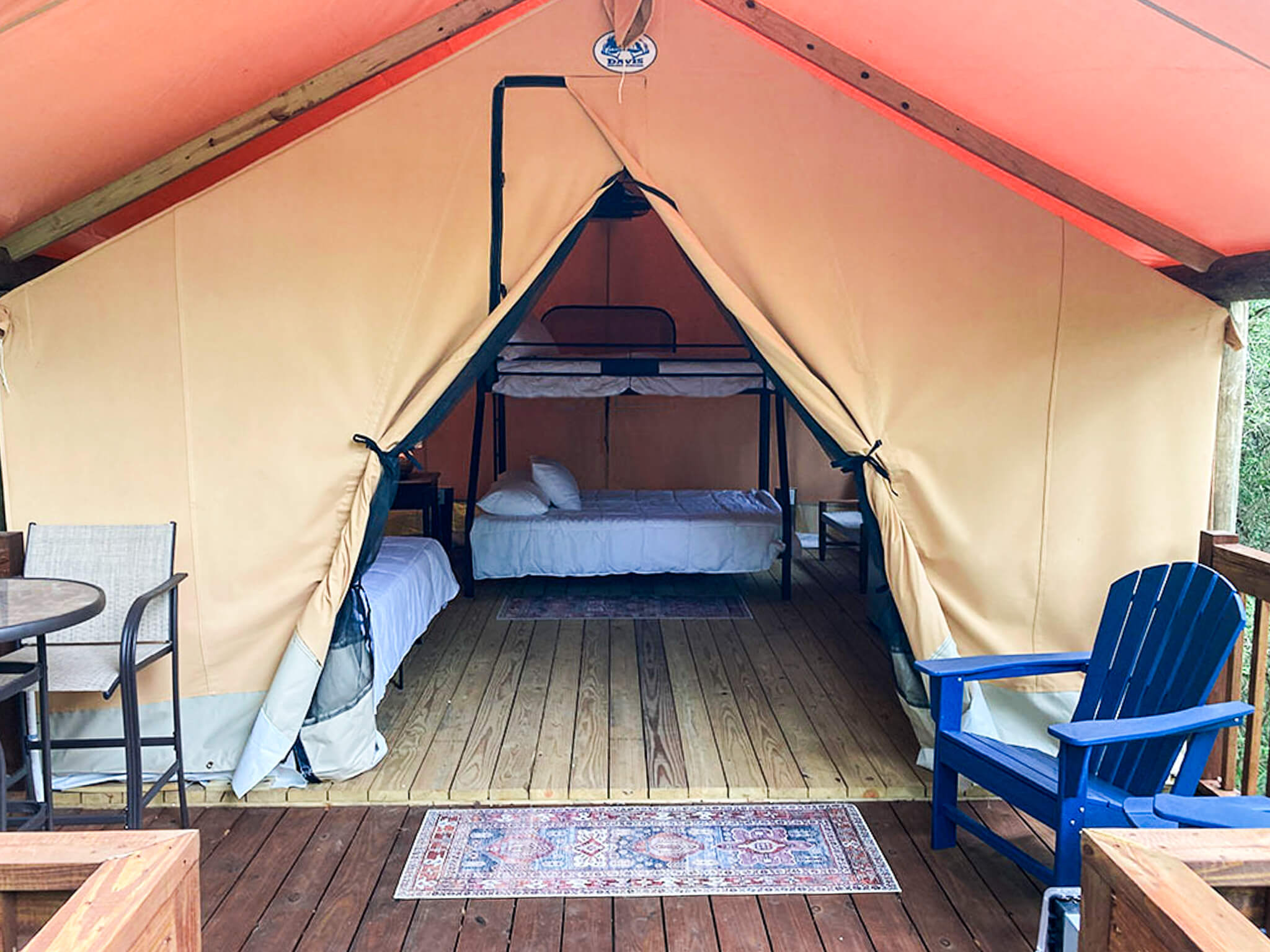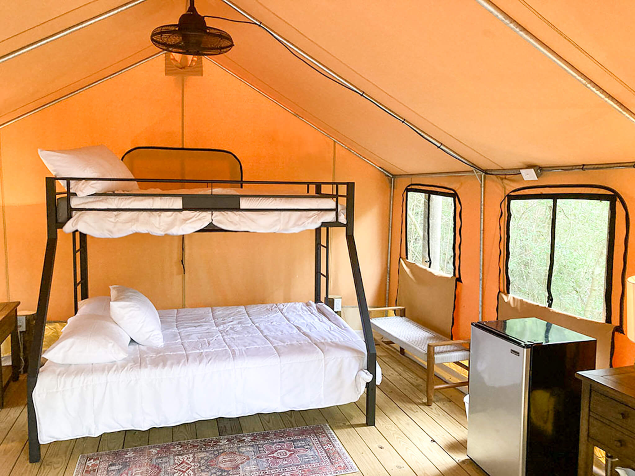 Huckleberry Hut offers the perfect balance between nature and comfort, bringing you a luxurious glamping experience in the heart of East Texas. This 14’x16′ tent sleeps four guests and is ideal for families or small groups who want to embrace the outdoors without sacrificing comfort. Inside, you’ll find a queen bottom/twin top bunk bed, an additional twin bed, a bedside table, a fan, a refrigerator, and a coffee pot—everything you need for a cozy stay surrounded by nature.