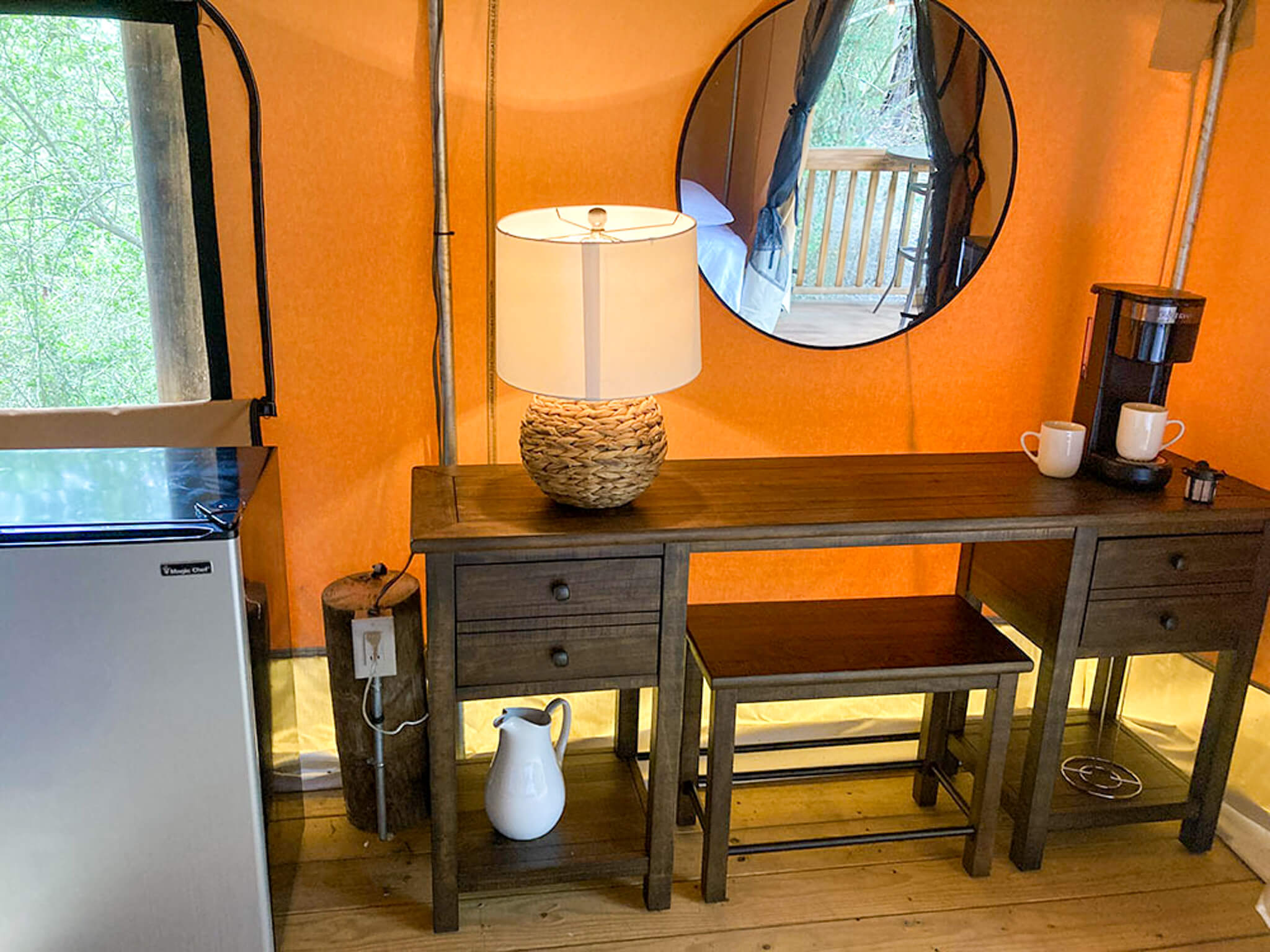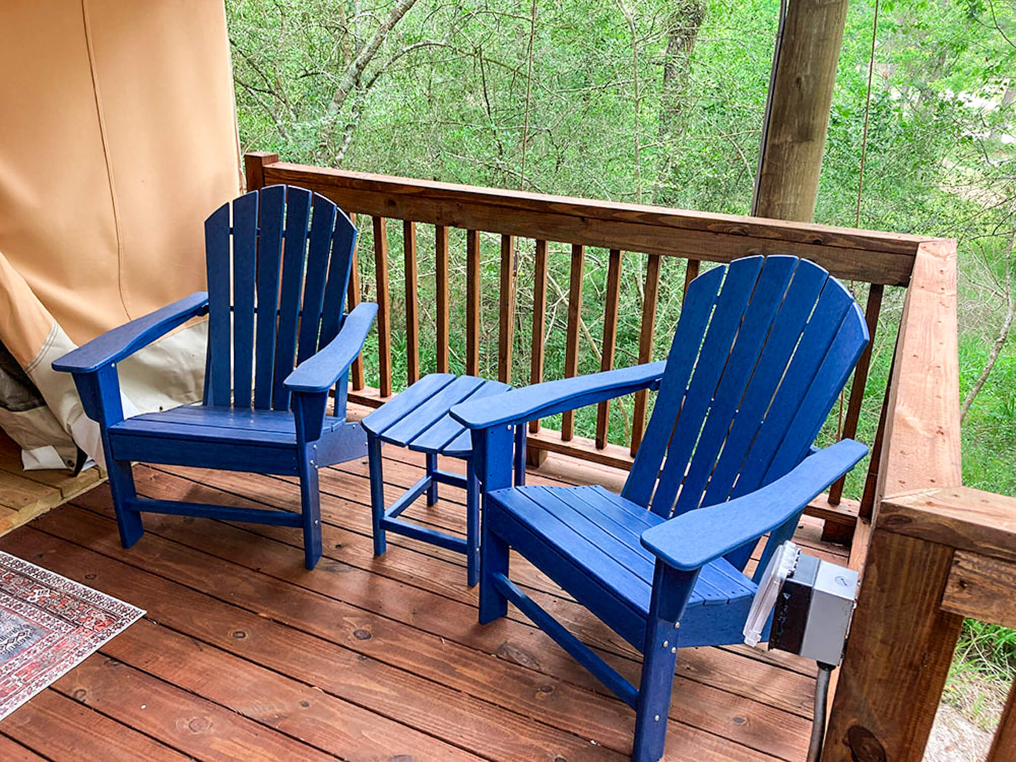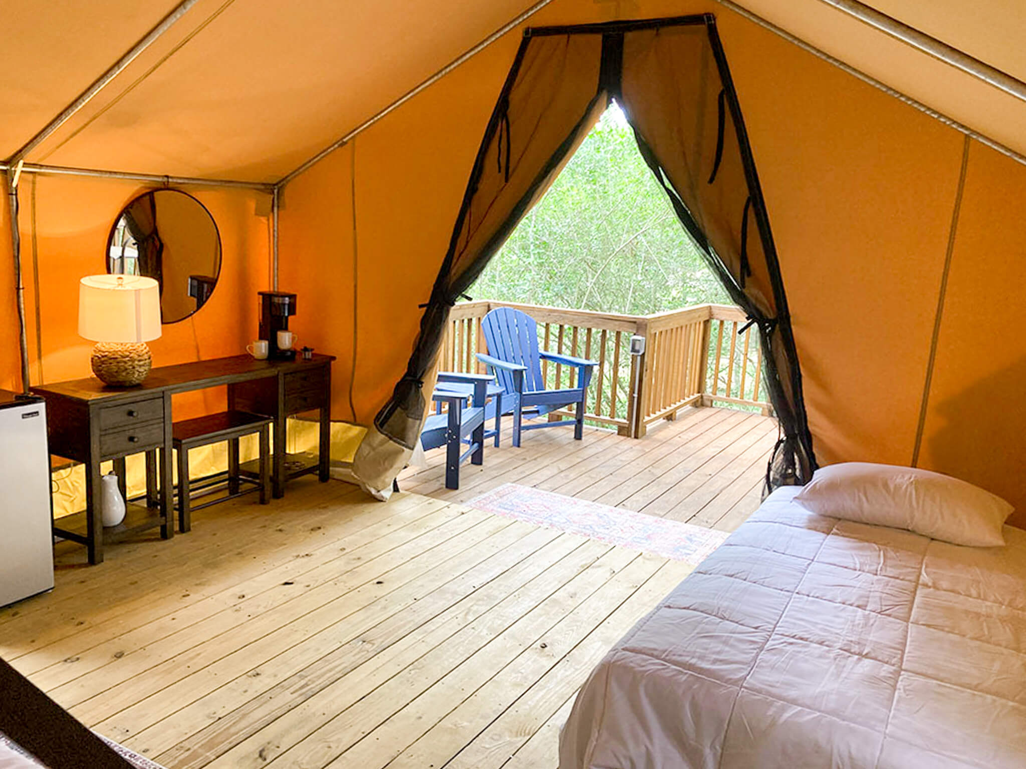 Step outside to the covered porch, where you can relax in two Adirondack chairs and enjoy the peaceful setting. The tent is equipped with portable air conditioning to keep you cool during warm nights, making it the perfect place to unwind after a day of outdoor adventure.