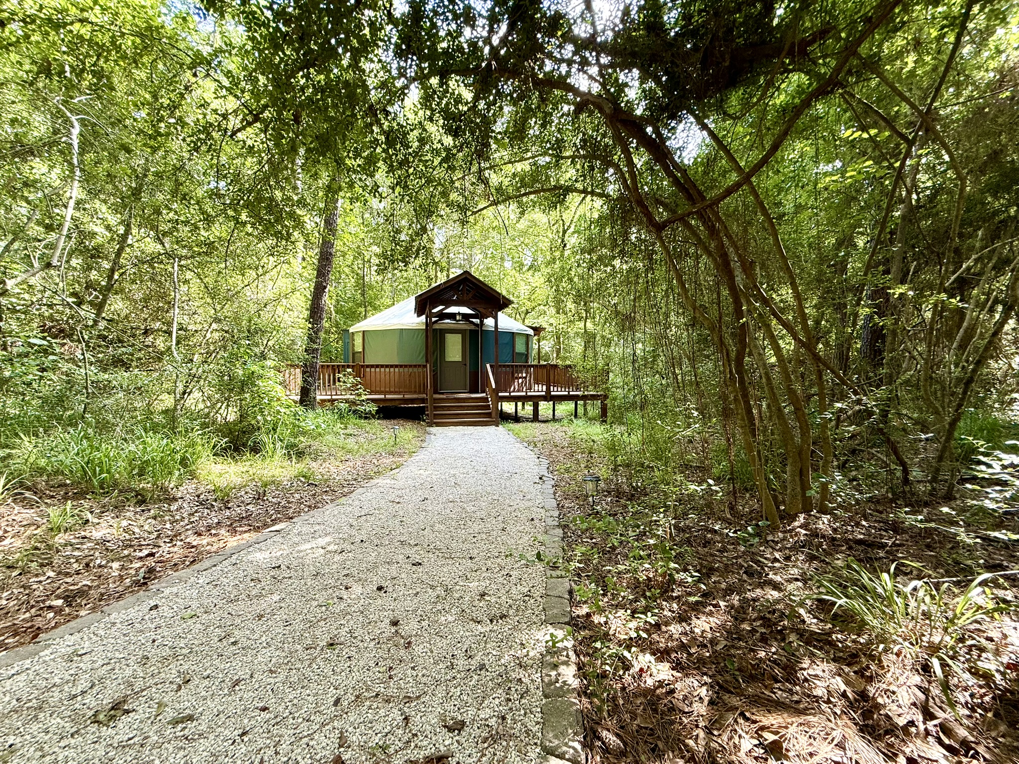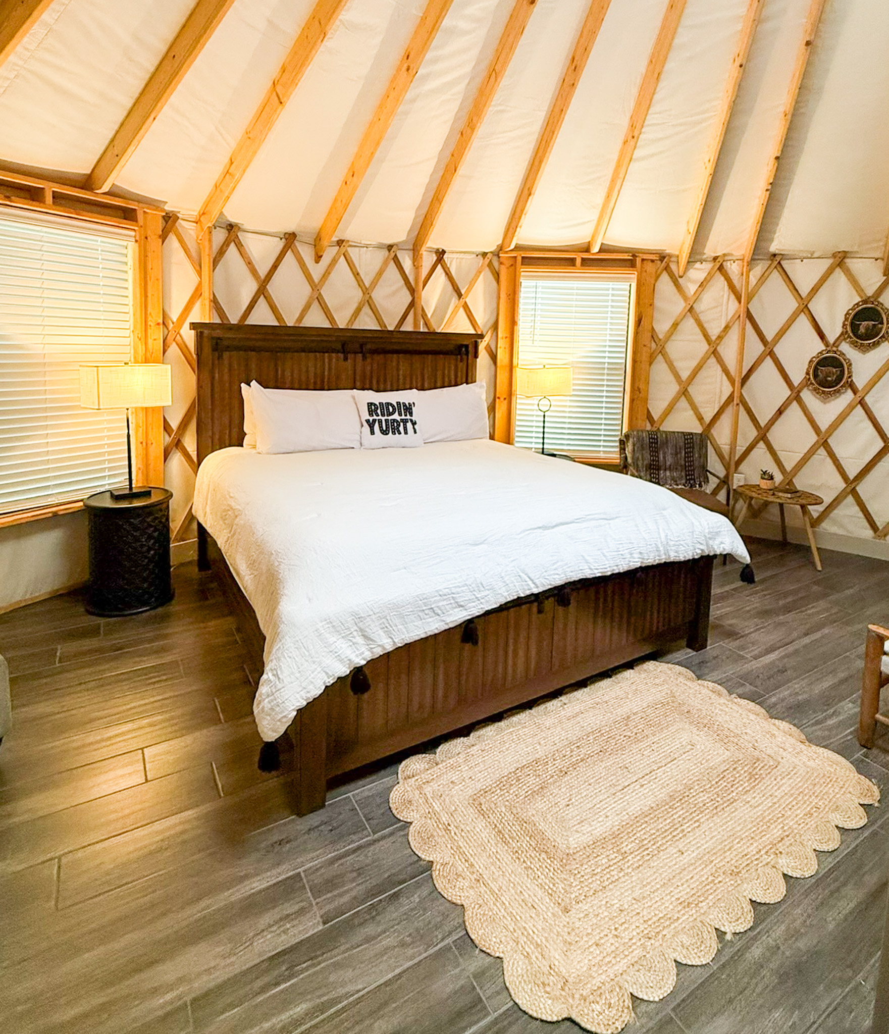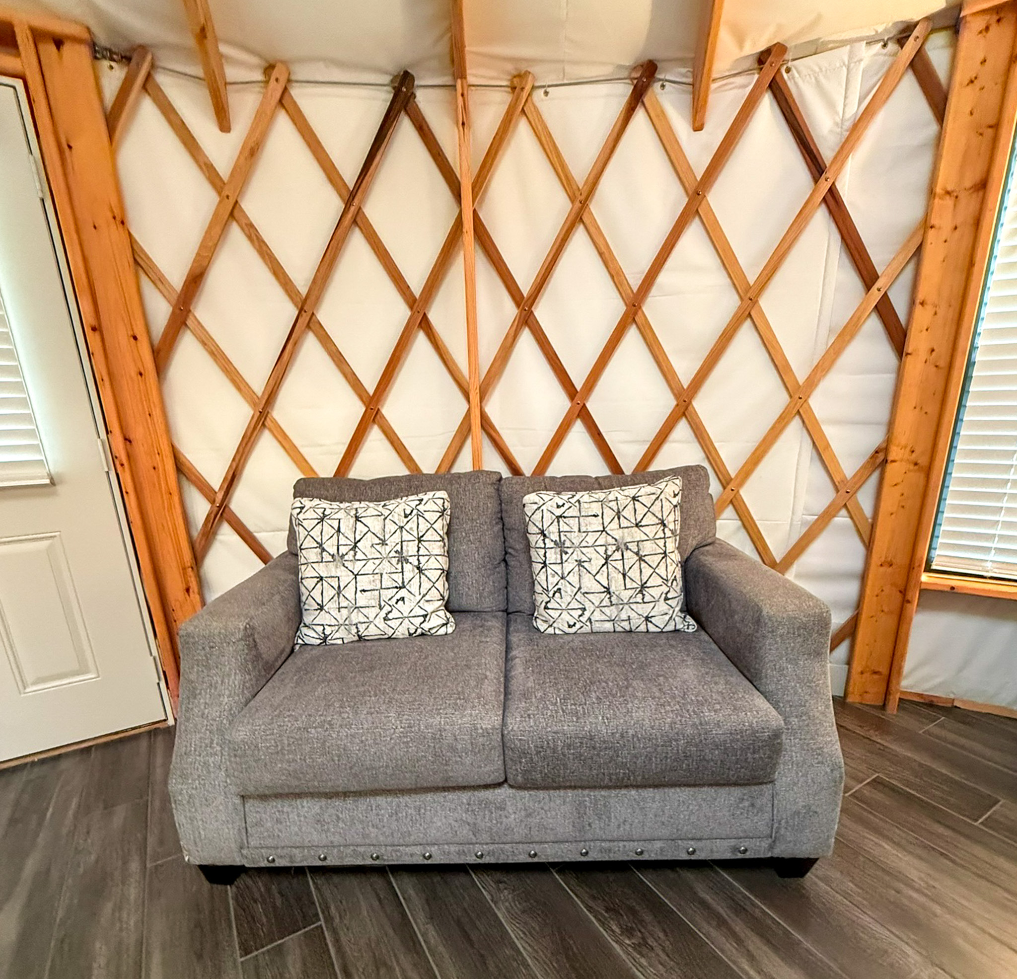 Equipped with a queen-size bed, full bath, kitchenette, and air conditioning, The Love Shack ensures you can relax in comfort while enjoying the beauty of the natural surroundings. Whether you’re escaping for a weekend or a longer stay, this yurt offers a serene ambiance that’s perfect for couples looking for romance and relaxation.